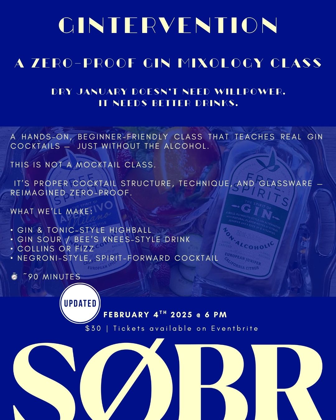 GINTERVENTION is a hands-on, zero-proof gin mixology class at SOBR Market Burlington for anyone who wants proper cocktails without the hangover.